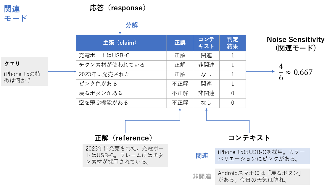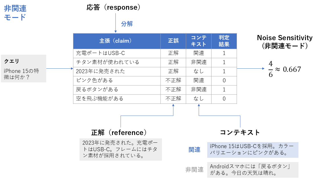 | 算出方法 | 1. 生成された応答(response)を主張(claim)ごとに分解する 2. 各主張について、正解(reference)を根拠としてその主張が正しいかどうかを判定し、あわせてその主張が取得されたコンテキスト(retrieved_contexts)に含まれる情報に基づいているかを確認する 3. 応答中に含まれる誤った主張の総数と、応答中の主張の総数を数える 4. 次の式を計算し、それをNoise Sensitivityとする \text{Noise Sensitivity} = \frac{誤った主張の総数}{応答中の主張の総数} |