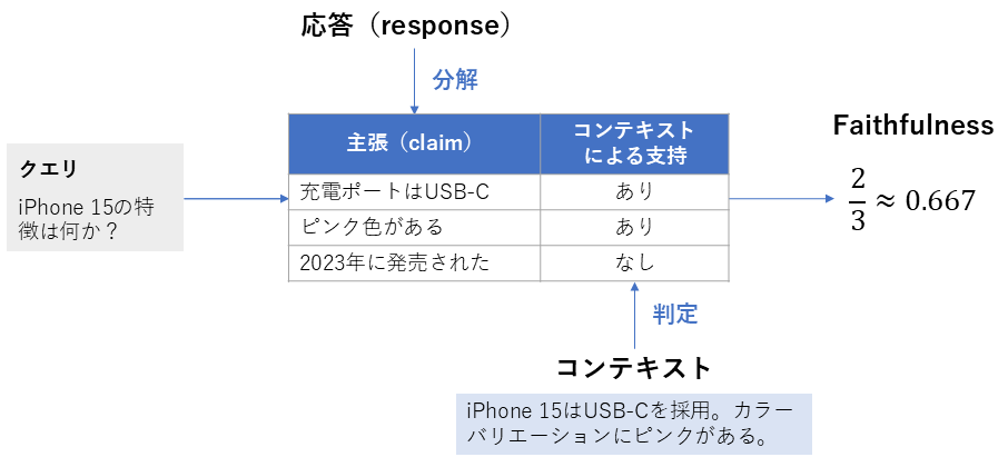 | 算出方法 | 1. 生成された応答(response)を個々の主張(claim)に分解する 2. 各主張について、取得されたコンテキストから支持できるかを判定する 3. 次の式を計算し、それをFaithfulnessとする \text{Faithfulness score} = \frac{\text{取得コンテキストから支持される主張の数 }}{\text{応答内の主張の総数}} |