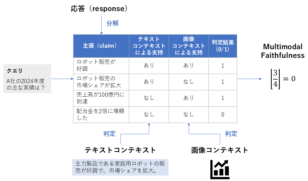 | 算出方法 | 1. 生成された応答( response )を、事実確認が可能な細かい主張(claim)に分解する 2. 分解した各主張について、取得されたテキストコンテキストまたは画像コンテキストの中に、その内容を裏付ける証拠があるかを判定する 3. 全ての主張に対して証拠が見つかればスコアを 1 とし、一つでも証拠がない(ハルシネーションを含む)主張があれば 0 とする |