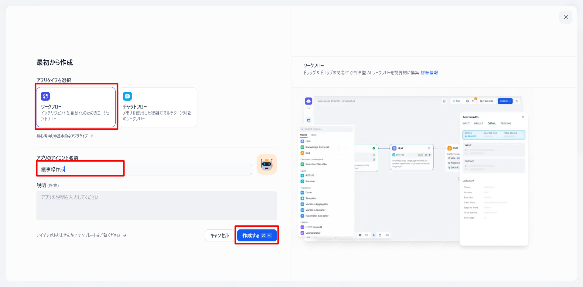 「ワークフロー」を選択し、「アプリのアイコンと名前」を入力してから「作成する」を選択します。