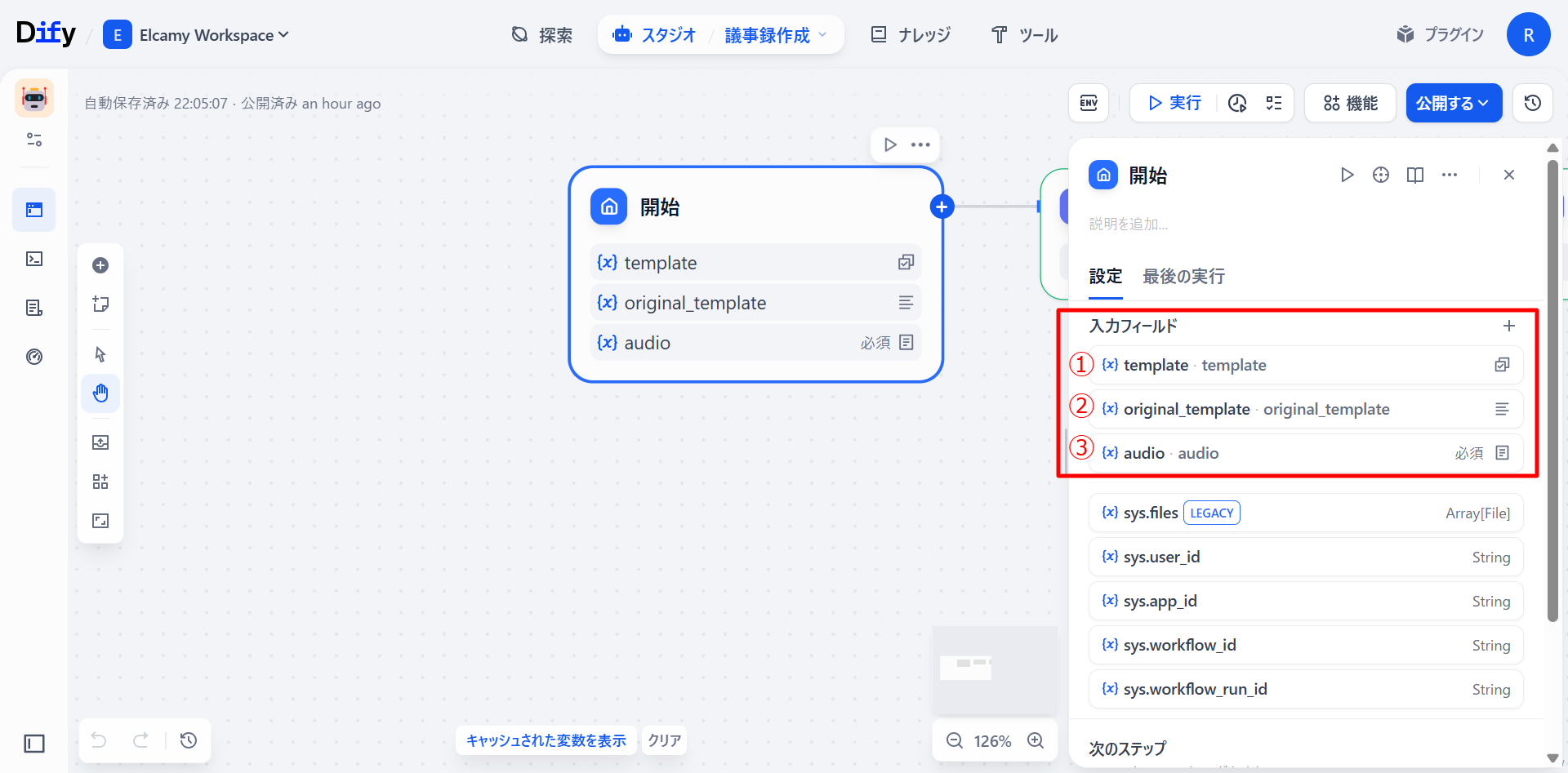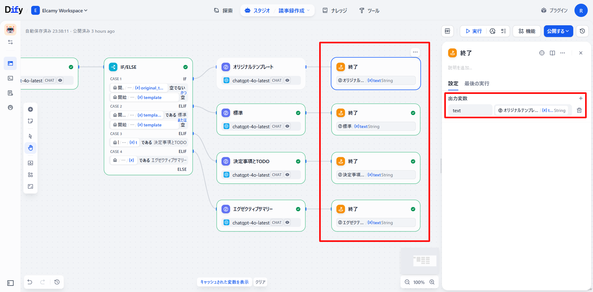 4つの「LLM」ノードに「終了」ノードを追加し、それぞれ出力変数を設定します。