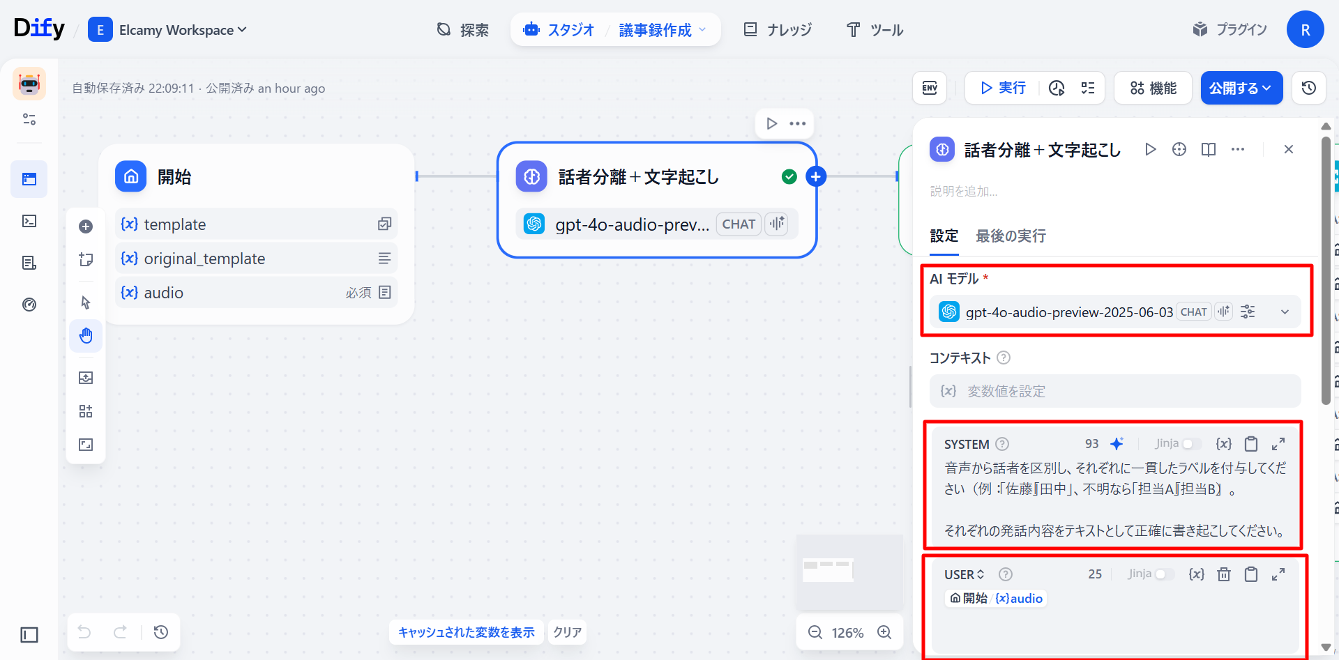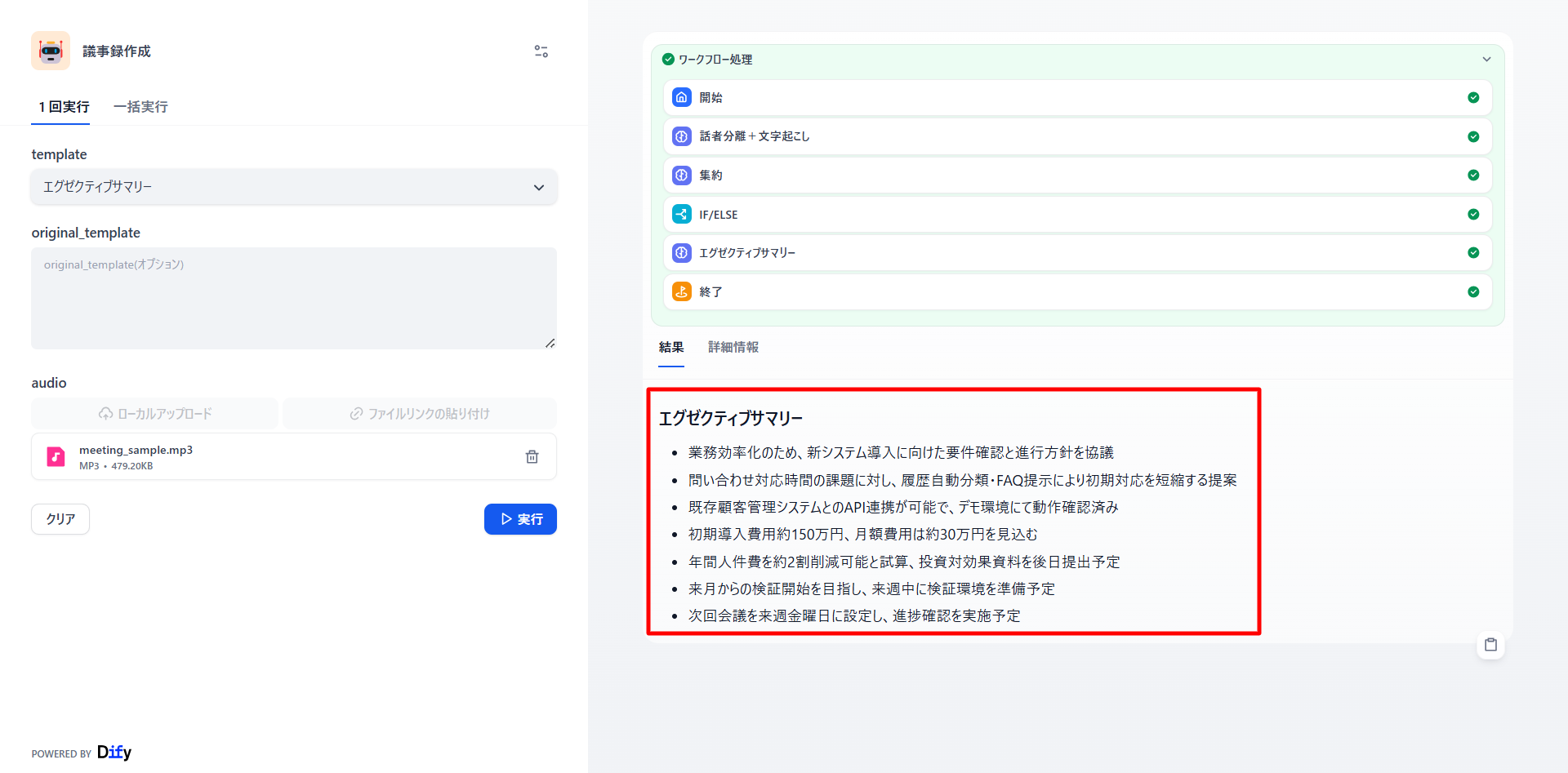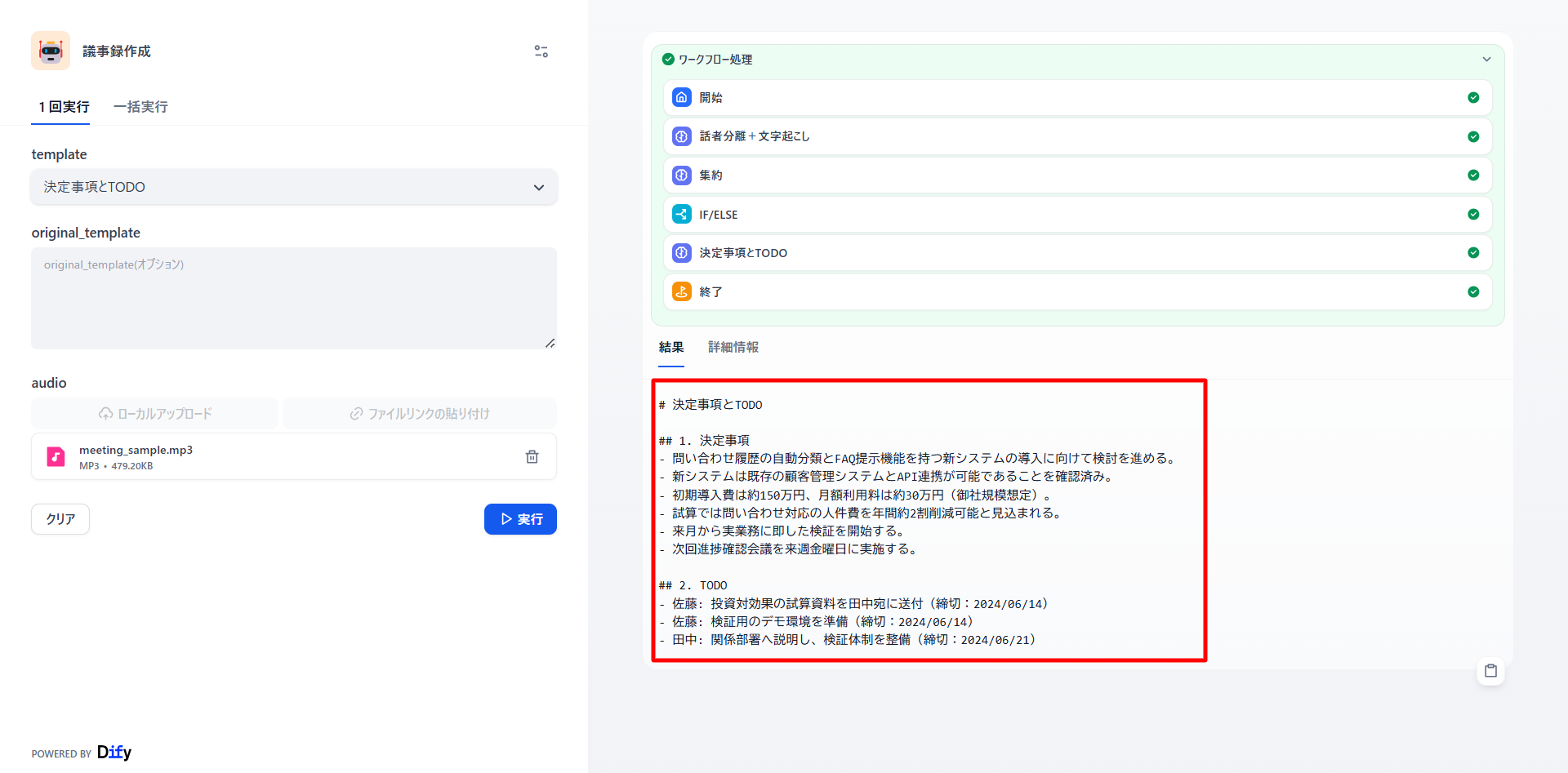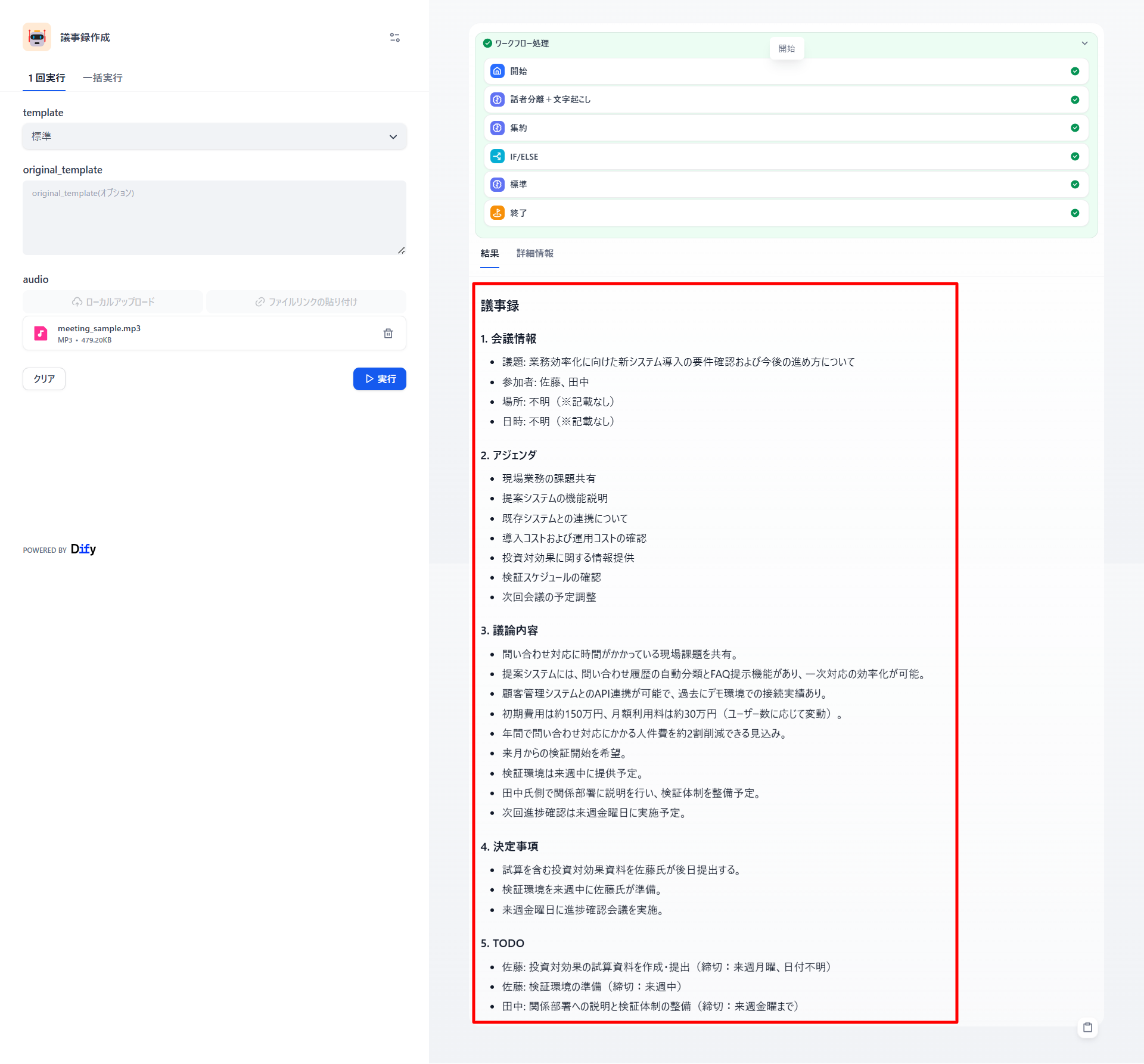 今回は第9回目で、会議の音声ファイルから、テンプレートを指定して議事録を作成するワークフローを作成する方法について紹介します。