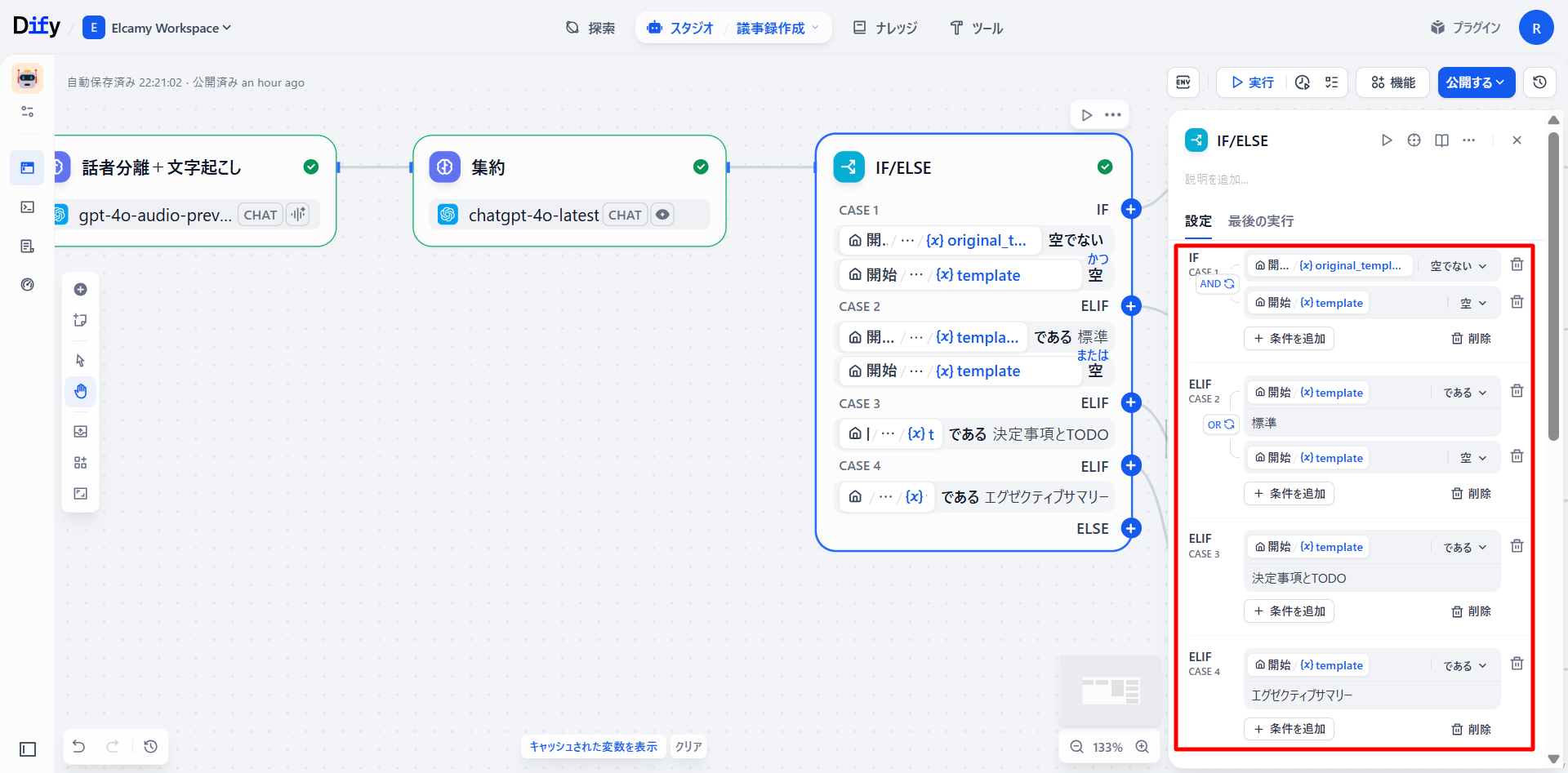 - 「IF/ELSE」ノードを追加します。このノードでは、以下の4つの場合に分けて議事録を作成するための条件分岐を作成します。