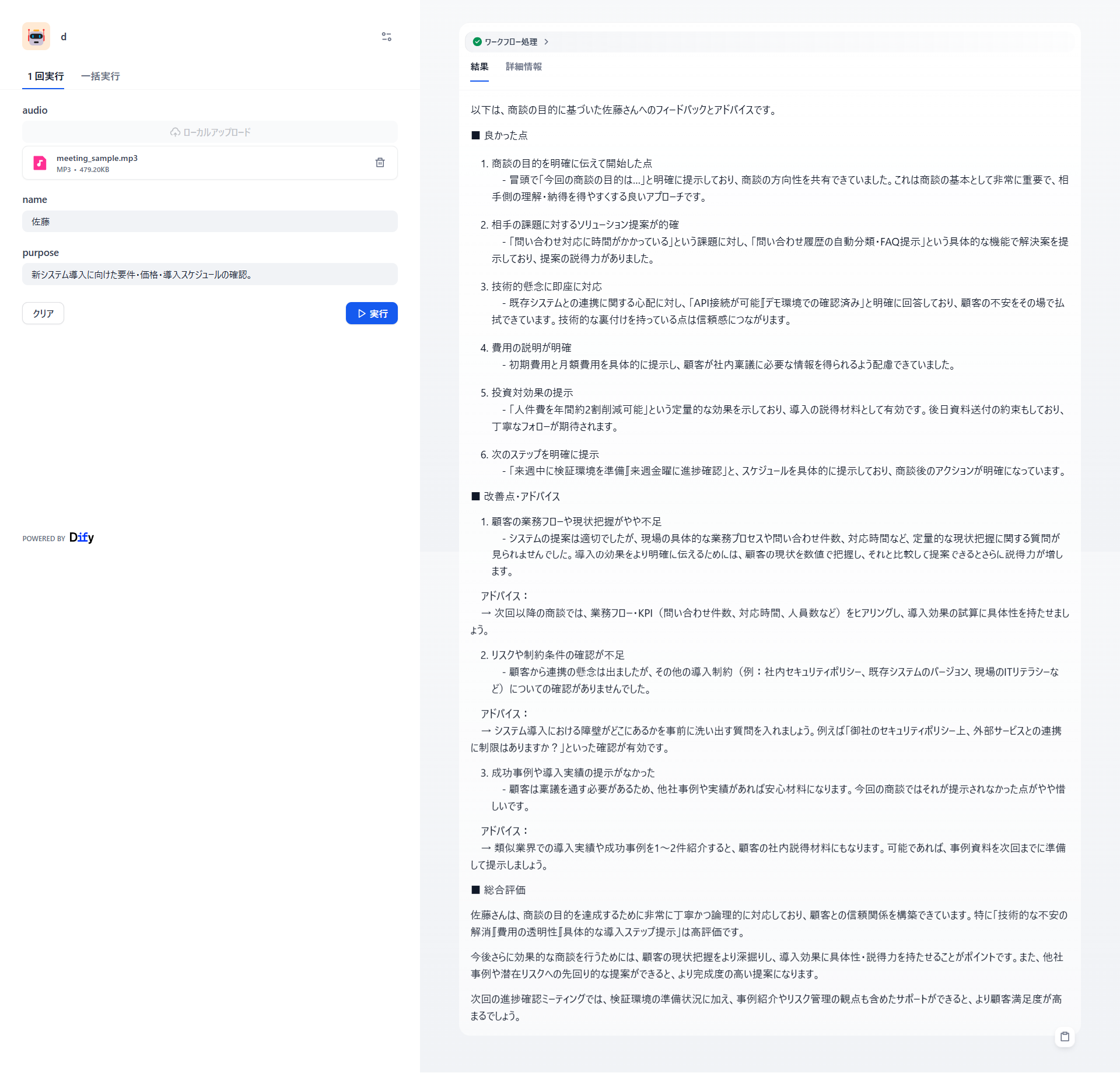 今回はDifyのUI(画面)を使用して議事録を作成しましたが、Slackと連携することで、チャンネルに議事録を投稿することも可能です。 さらに、会議の音声ファイルをもとに、特定の人物へのアドバイスを生成するワークフローを作成することも可能です。