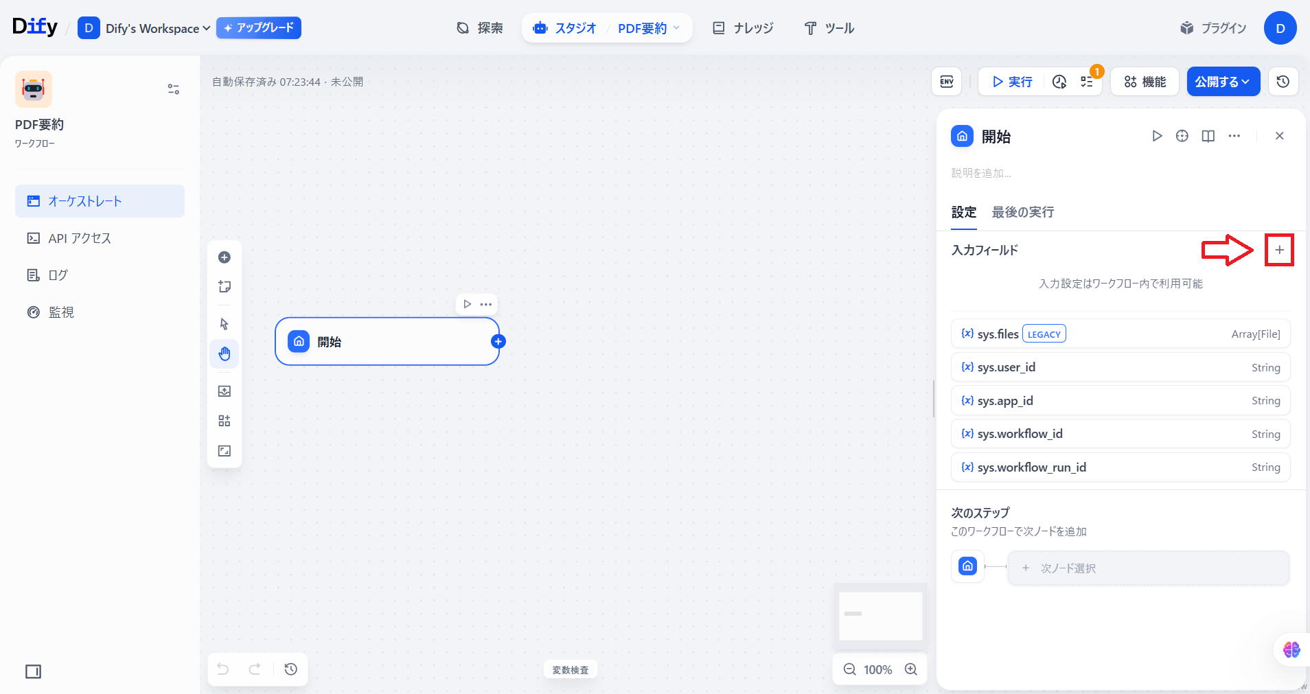 ワークフロー作成画面が表示されます。「開始」ノードが表示されているので**「開始」**ノードを選択します。 「開始」ノードにPDFをアップロードするための機能を設定します。 「+」ボタンを押します。