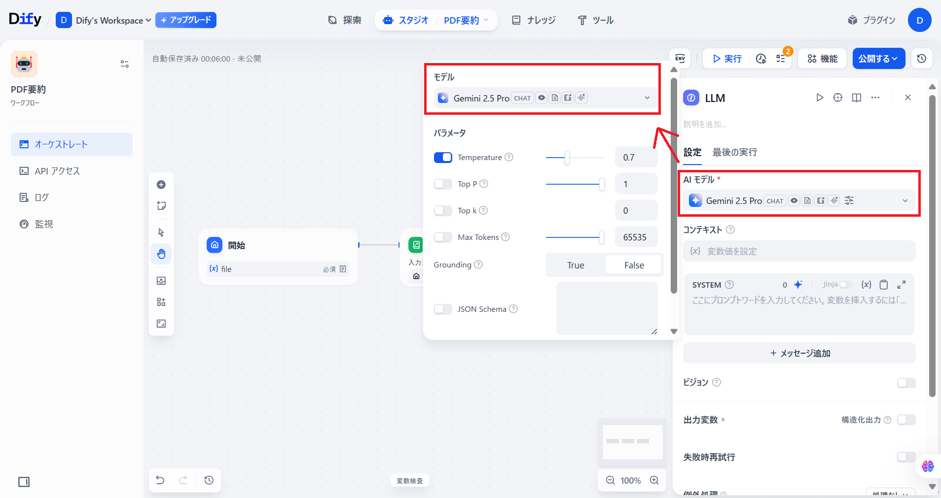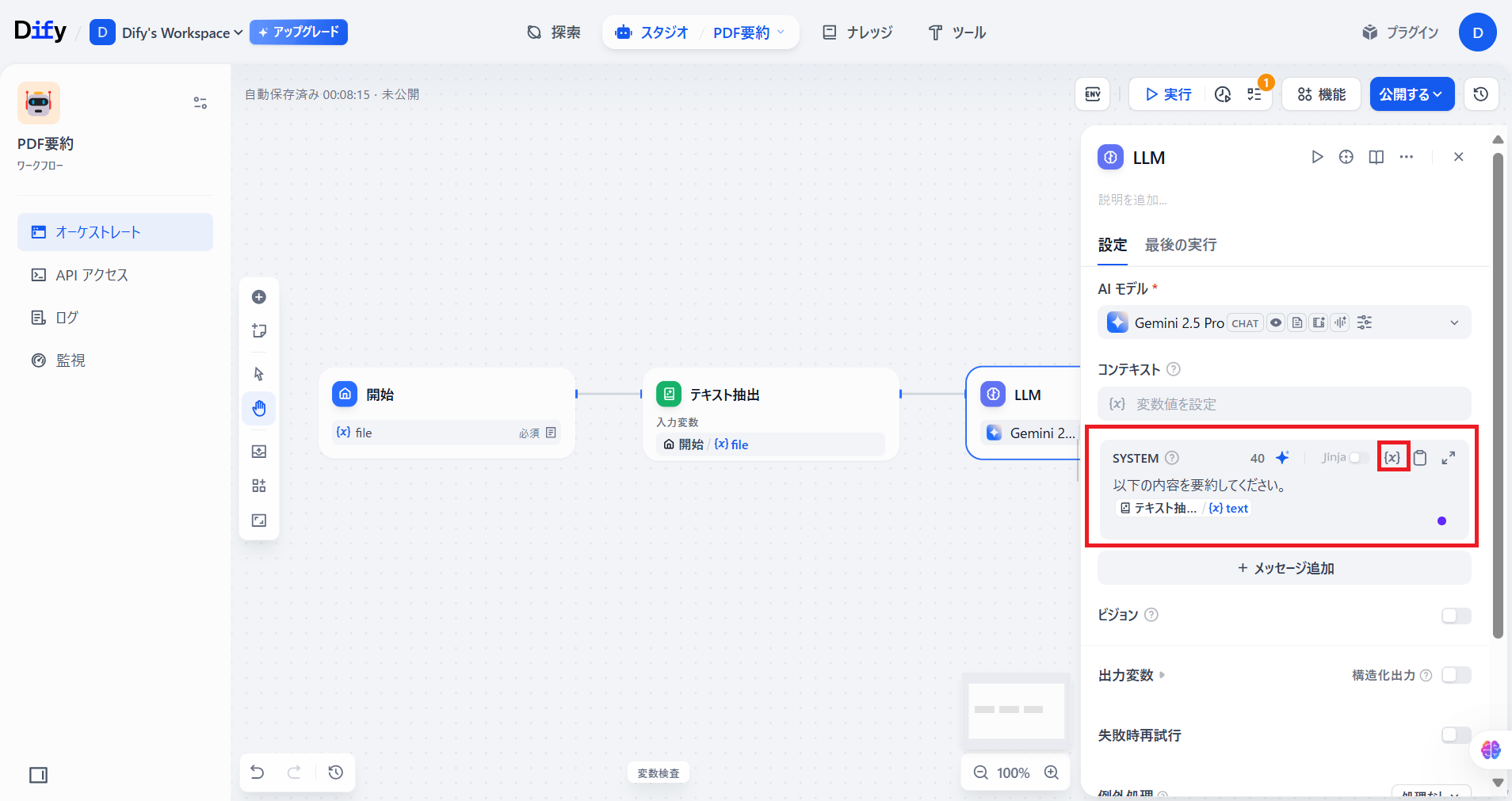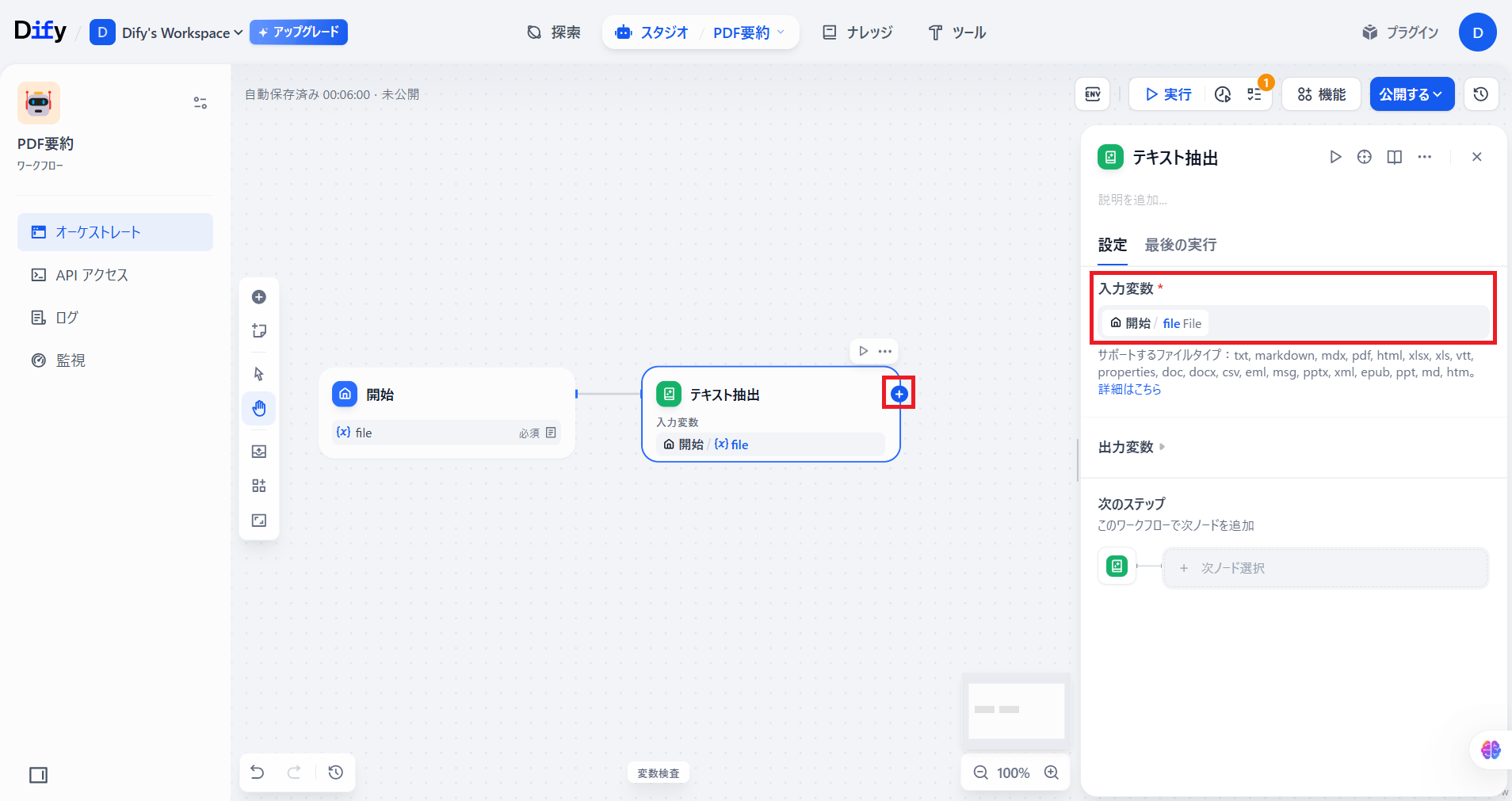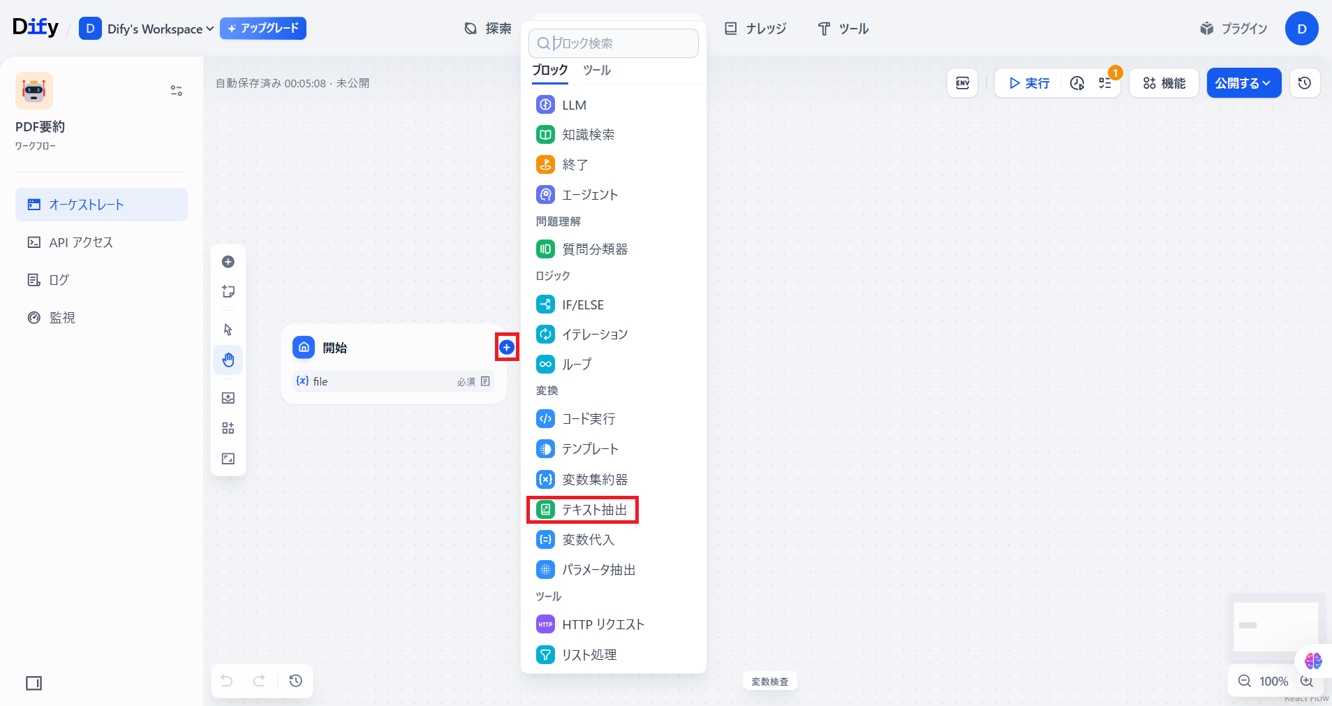 - 「テキスト抽出」ブロックでPDFの内容を読み込み、LLMが理解できるようにします。