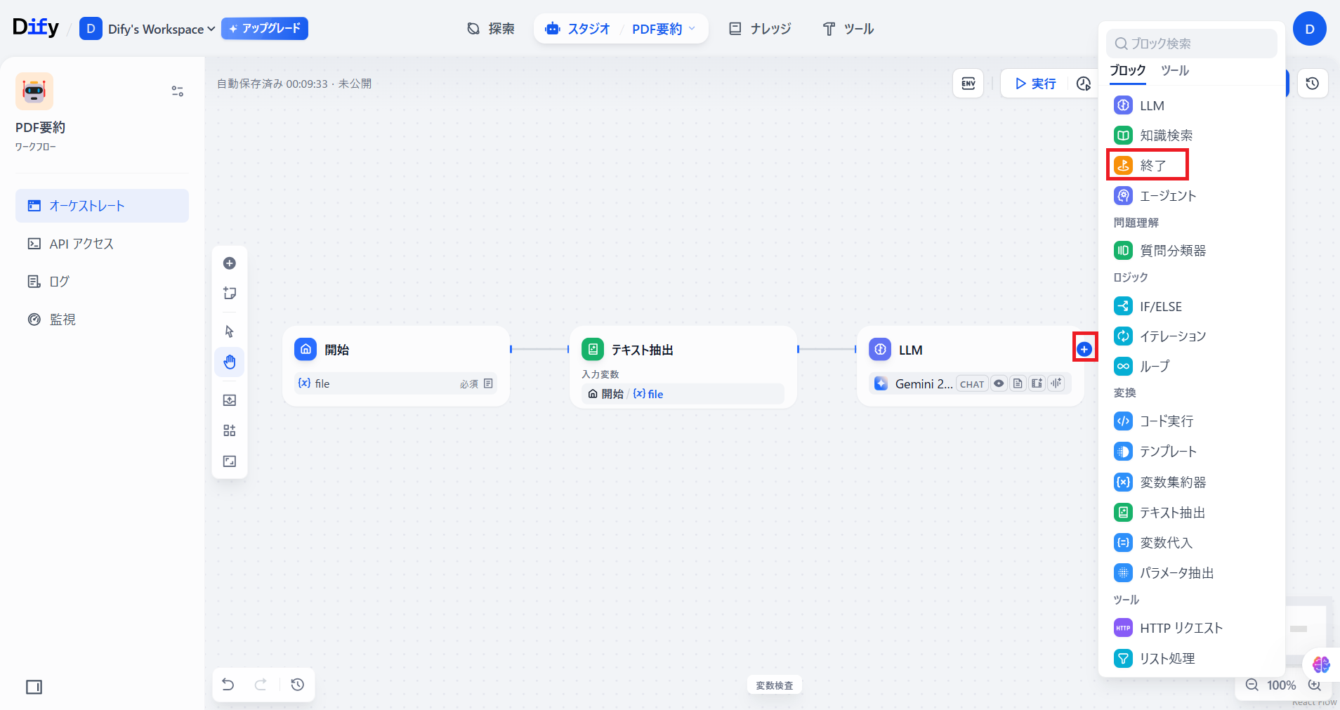 「LLM」ノードの「+」ボタンを押し、**「終了」**を選択します。