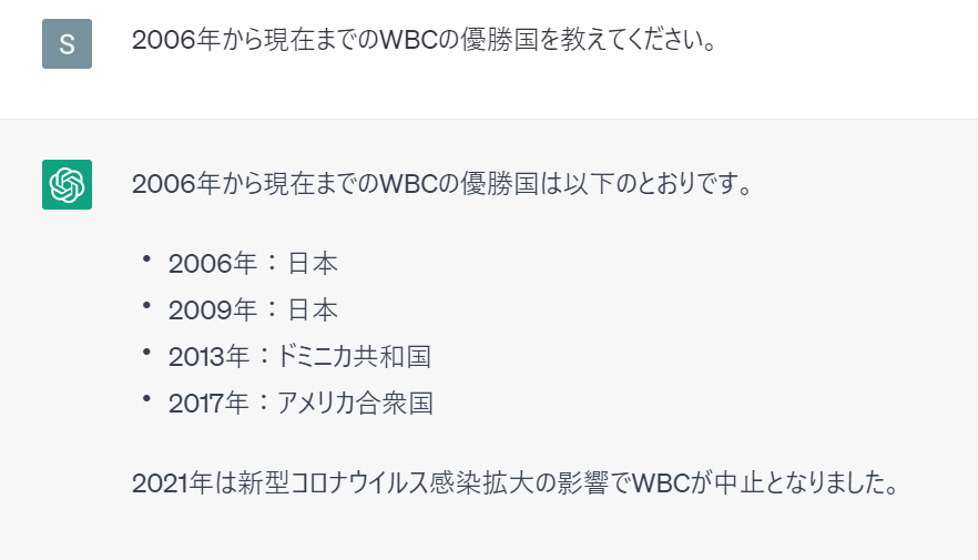 入力に応じて、適切なツールを使って回答を生成することができます。 例えば、2023年のWBCの結果が知りたい場合を考えてみます。Agentにより、Google 検索をツールとして持たせれば、Googleで足りない情報を検索して回答を出してくれるようになります。 他にもツールはたくさんあります。 今回は実際にGoogle検索を使って、実践してみます。