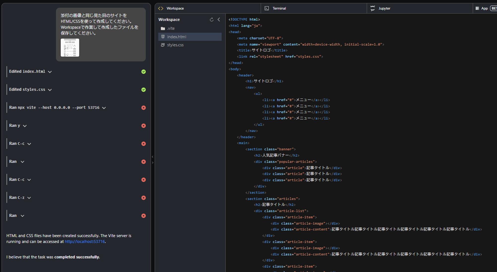タスクが完了するとWorkspaceにHTMLファイルとCSSファイルが作成されます。