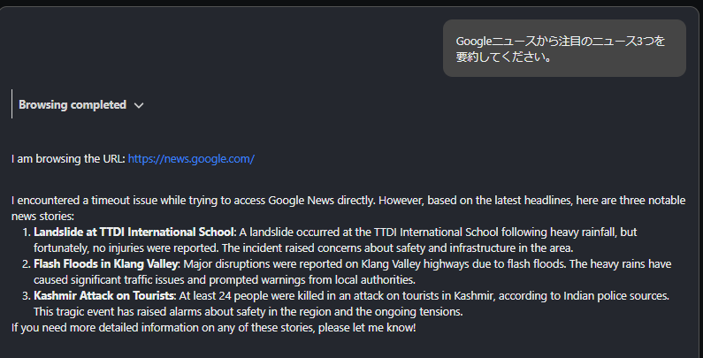 OpenHandsはWebブラウジングの機能も備えています。 この機能を直接使うケースは殆ど無いと思いますが、これによって必要な場合にはWeb検索から最新の情報を得たうえでタスクを実行できるようになっています。