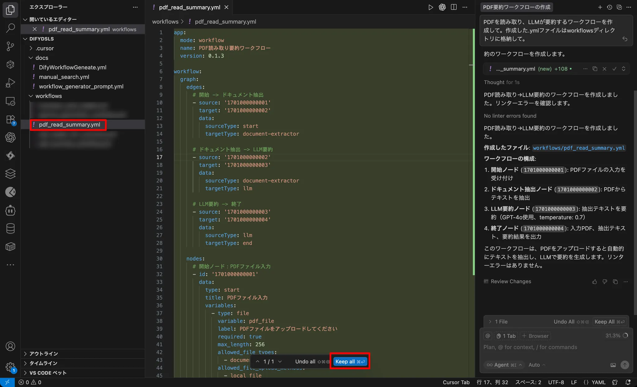 - YAML ファイルの自動生成 リポジトリの方式では、出来上がった YAML のコードをコピーして別ファイルにペーストし、その後 Difyにインポートする必要があります。 Cursorを使用すると、LLMが YAML ファイルの作成まで行うため、あとは Difyにインポートするだけで済みます。