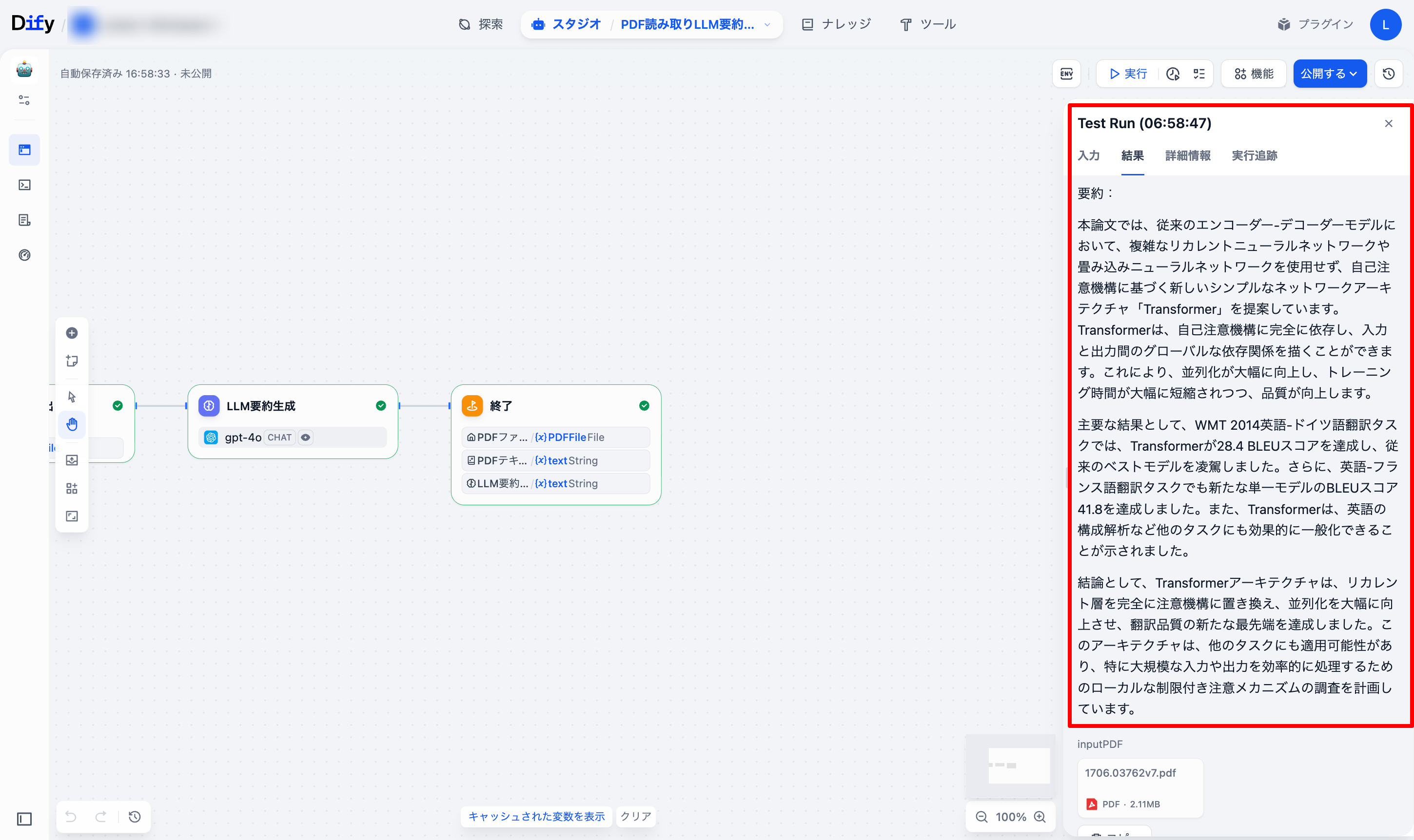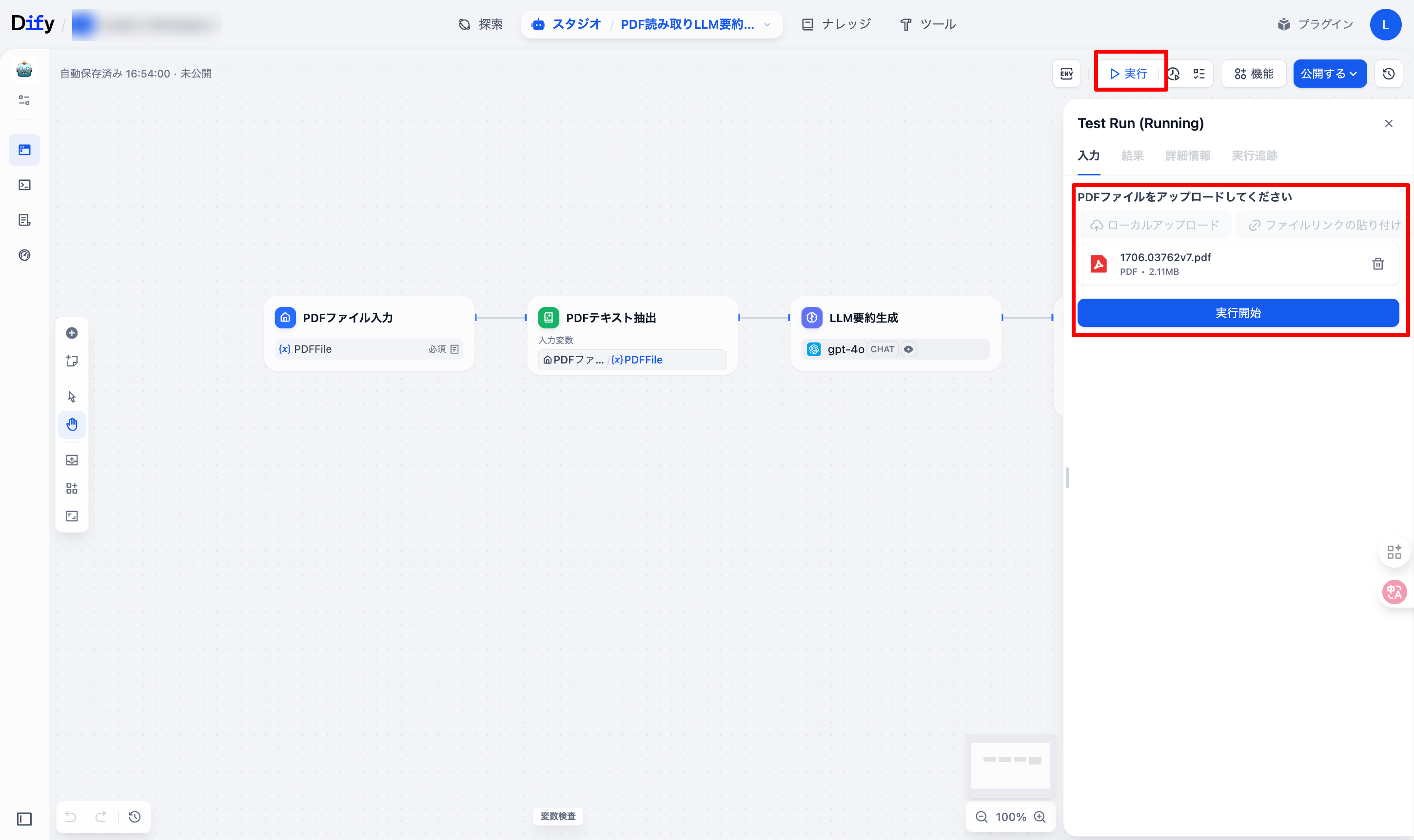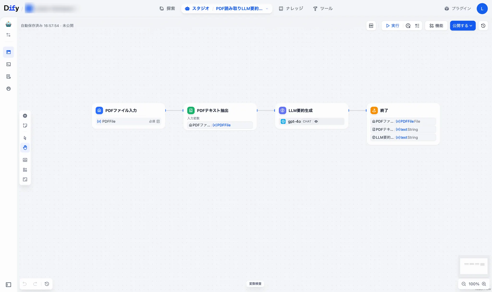 作成されたDSLファイルをDifyにアップロードすると、ワークフローが読み込まれます。下記のような、PDFを読み取りLLMが要約するワークフローを読み込むことができました。
