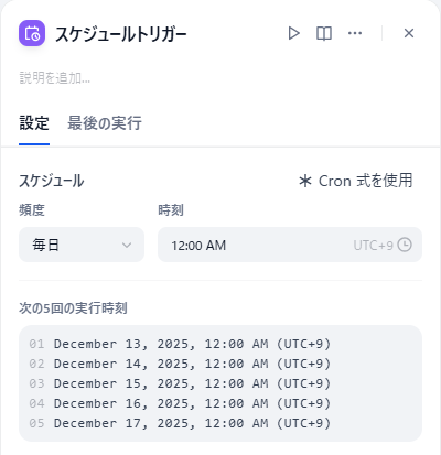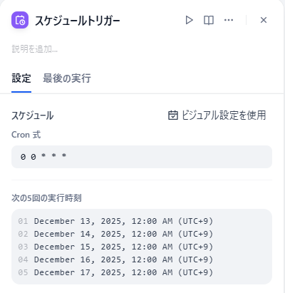 - Cron式 標準的な5フィールドのCron式を使い、分単位で設定できます。細かい間隔(例:●分ごと/●時間ごと)や複数条件の組み合わせ(例:平日8:00~19:00に1時間ごと)を設定したい場合に適しています。