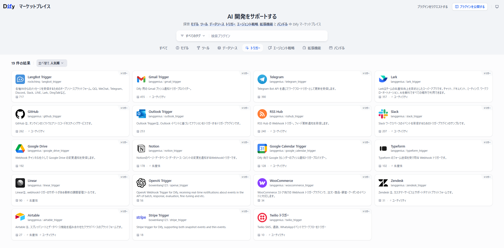 外部アプリのイベントによって実行されるトリガーです。よく使われるアプリには予めプラグインが用意されています。2025年12月12日時点、マーケットプレイスには19個のプラグイントリガーが公開されています。