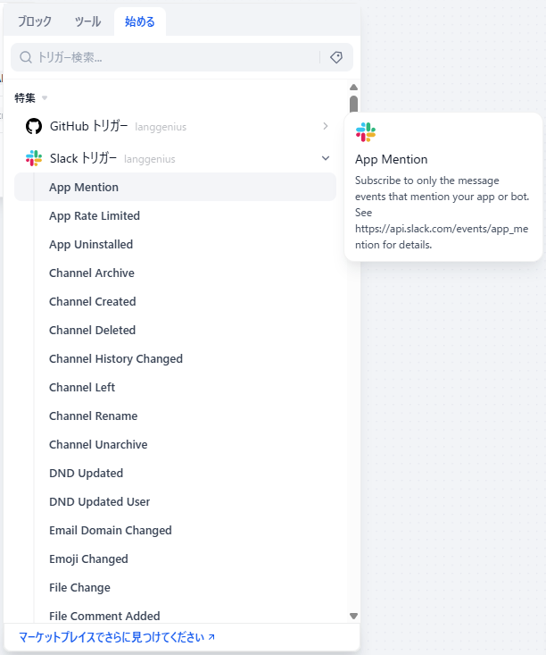 各プラグイントリガーでは複数のイベントを設定できます。例えば、Slackプラグインの場合、アプリへのメンションやチャネルの作成など多くのイベントが用意されています。