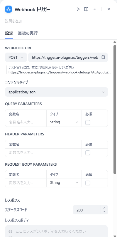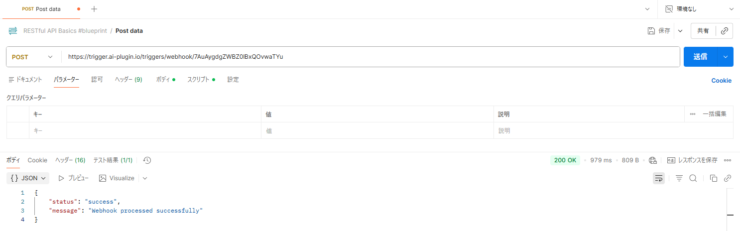 なお、今回のテストではWebhookトリガーの実行を簡単に試せるPostmanを利用しました。