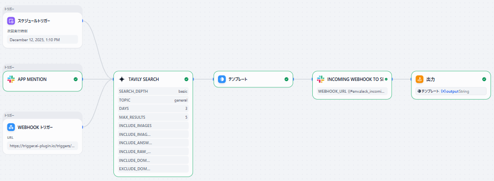 トリガーが実行されると、その時点の日経平均株価を検索し、Slackに通知するワークフローです。