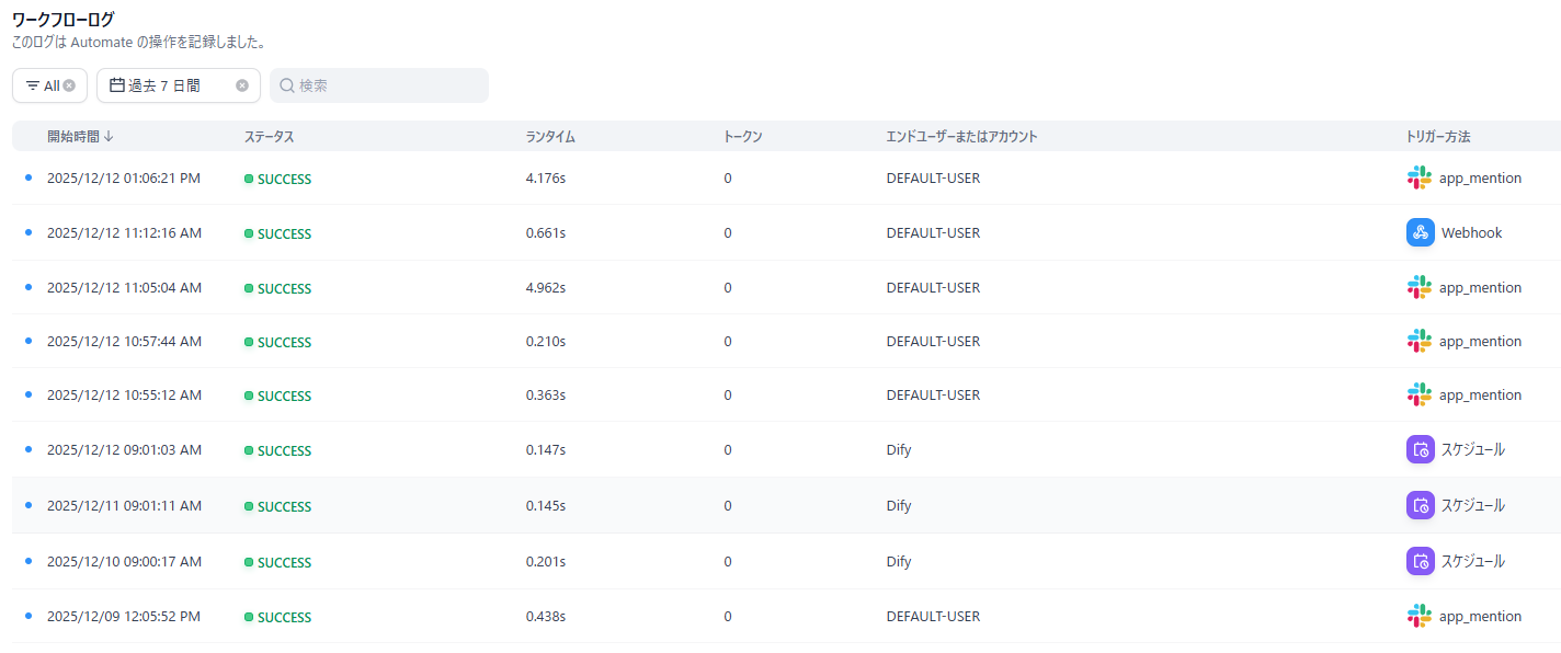 ワークフローのログには「トリガー方法」という列が追加され、実行されたトリガータイプが確認できるようになっていました。スケジュールトリガーの場合、実行までに1分ほどのラグが生じることがありました。
