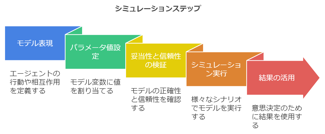 シミュレーションは、一般的に以下のモデリングとシミュレーションのステップで進められます。