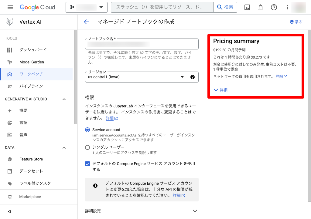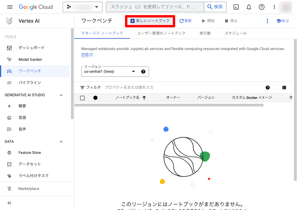 Vertex AI Workbenchインスタンスを作成します。 Google Cloud Console上で、マネージドノートブックかユーザー管理のノートブックを選んでインスタンスを作成します。