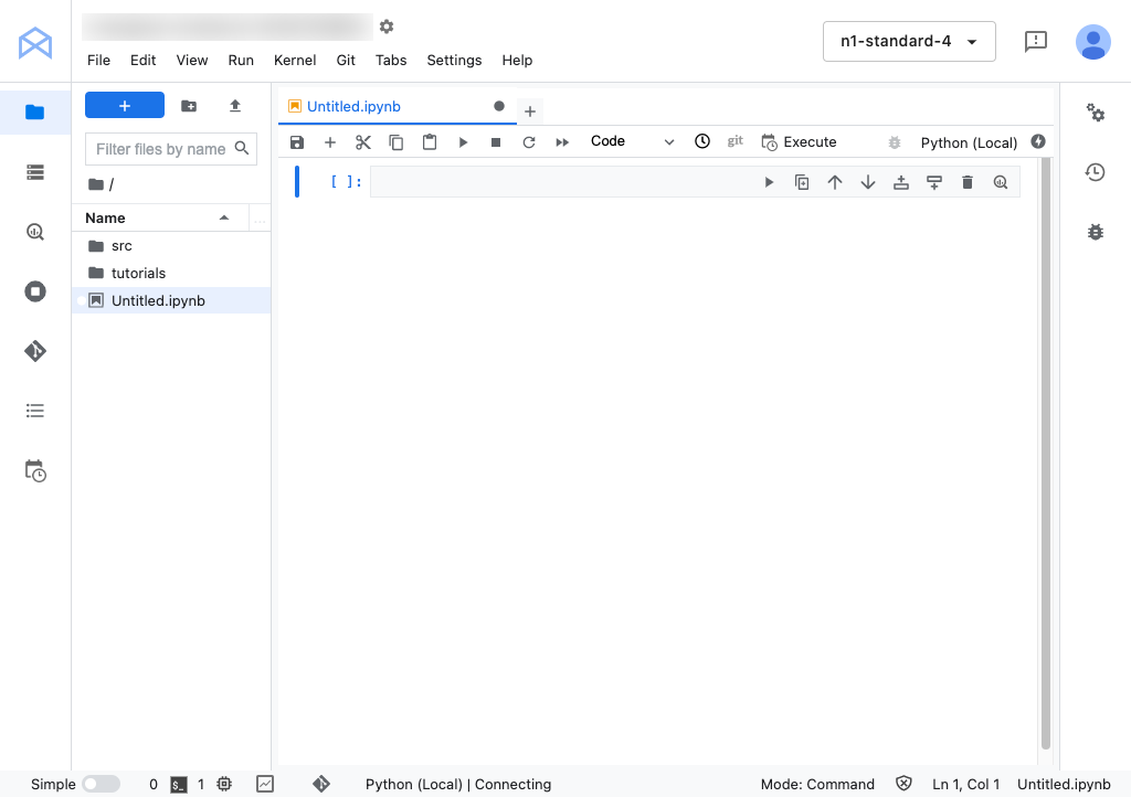 作成したノートブックのインスタンスに接続します。 インスタンスを使用する準備が整うと、Vertex AI Workbench で [JupyterLab を開く] リンクが有効になります。