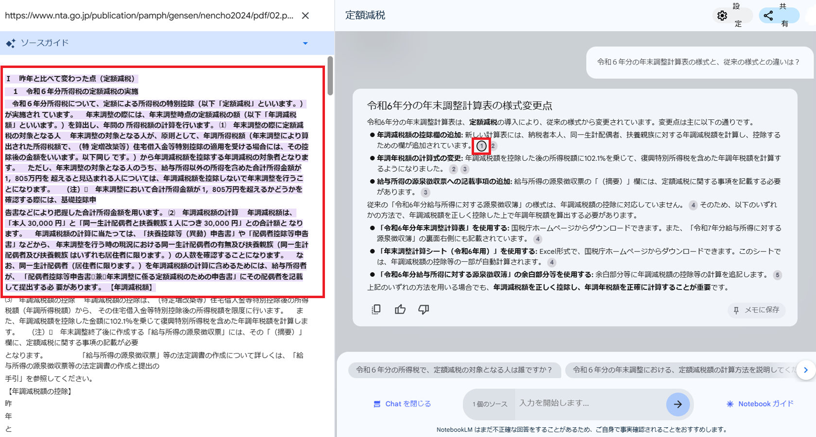 回答は要点を抑えていてわかりやすく、自分で資料を読んで理解するよりも早いと感じました。 さらに、ソースのどこの部分を根拠として回答しているのか、引用元もしっかり教えてくれます。 「この業務の根拠となる部分ってどこだっけ?」とド忘れしたときに、一瞬で答えと引用元を出してくれるNotebookLMはかなり時間の短縮をしてくれますね。