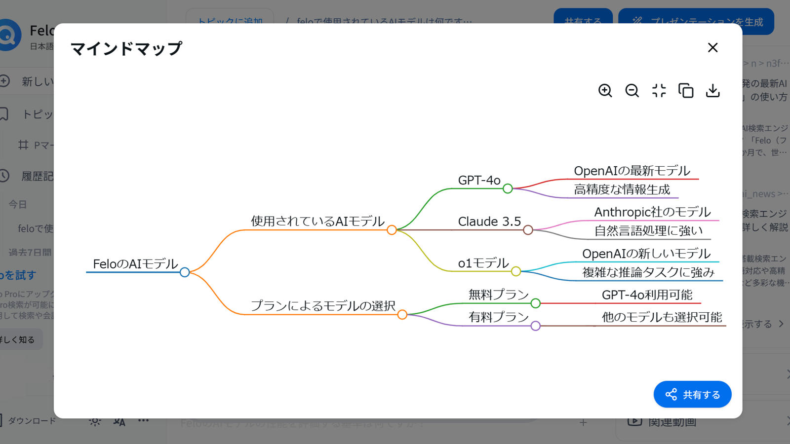 検索結果を視覚的に整理するためのマインドマップを生成できます。情報の関連性や全体像を直感的に把握でき、複雑な情報を理解しやすくなります。