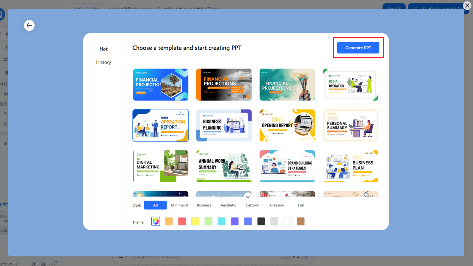 検索結果をもとにスライドを自動生成することができます。ユーザーはキーワードを入力し、結果から「プレゼンテーションを生成」ボタンをクリックするだけで、数十秒でスライドが完成します。この機能はビジネスや学術的なプレゼンテーションに役立ちますね。