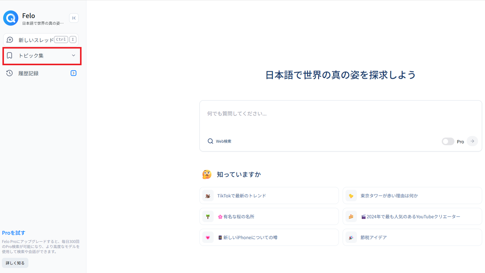 検索した情報を種類別にまとめたり、後で簡単に見返せるように整理することができます。長期的なプロジェクト管理や特定のトピックに関する研究データの整理に役立ちます。 まずはトピック集をクリックします。