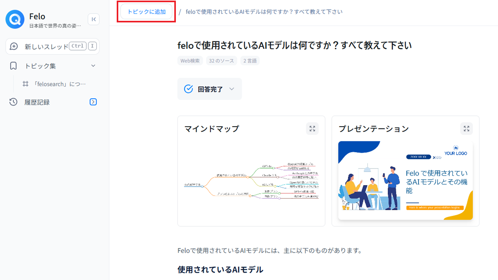 トピックコレクション機能でリサーチ結果をトピックごとに整理することができます。ユーザーは特定のテーマに関連する情報をまとめて保存し、後で簡単にアクセスできるようになります。 また、マインドマップ機能も備えており、複雑な情報を視覚的に整理するのに役立ちます。