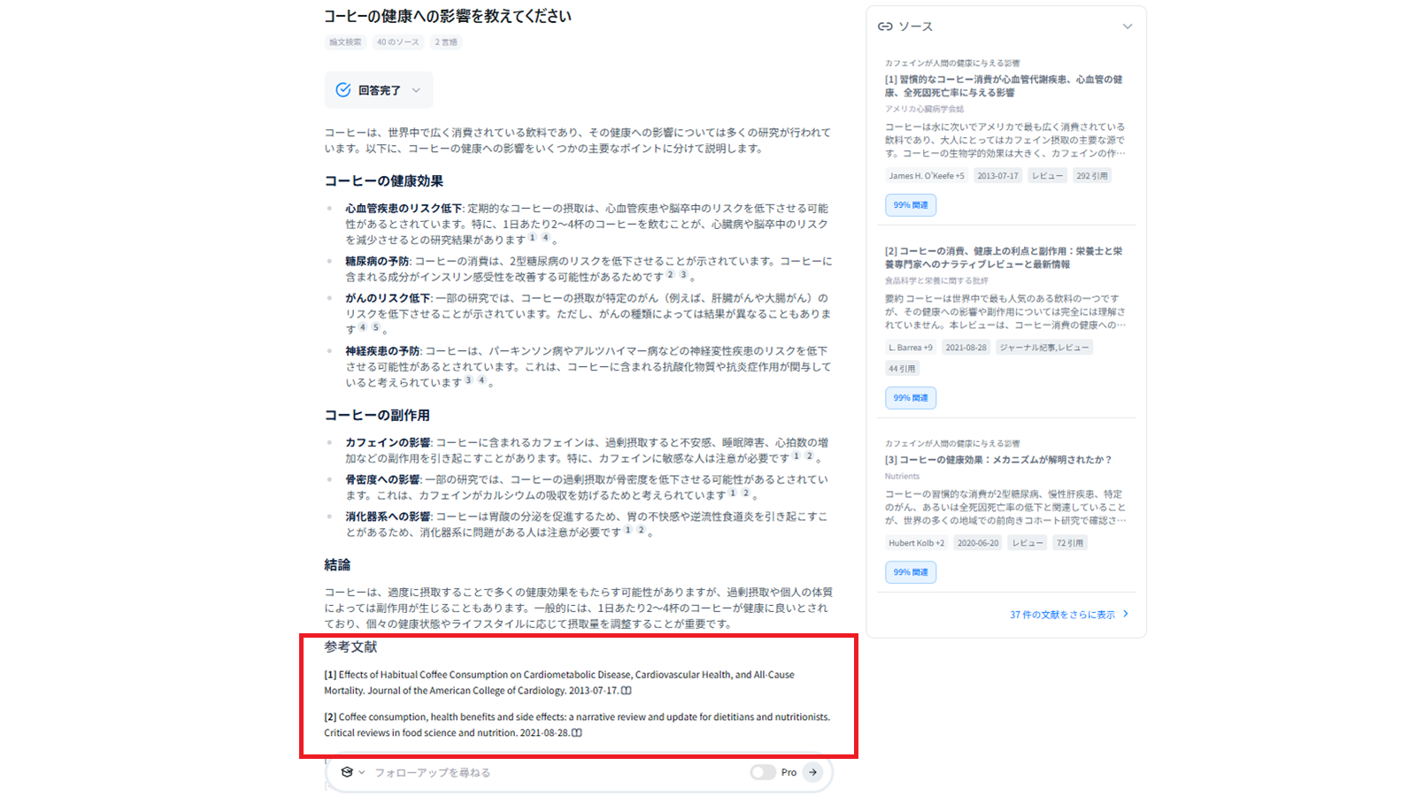 先ほどと同じ「コーヒーの健康への影響を教えてください」という質問を、プロフェッショナル検索機能を使用した上で論文検索してみます。