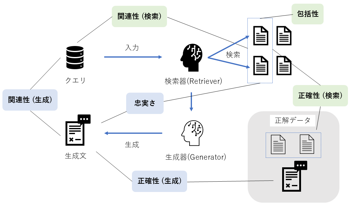 内部評価は、RAGシステムを構成する機能の技術的な性能に焦点を当てます。 RAGは主に「検索(Retrieval)」と「生成(Generation)」という2つのプロセスから成り立っており、それぞれ以下の観点で評価されます。
