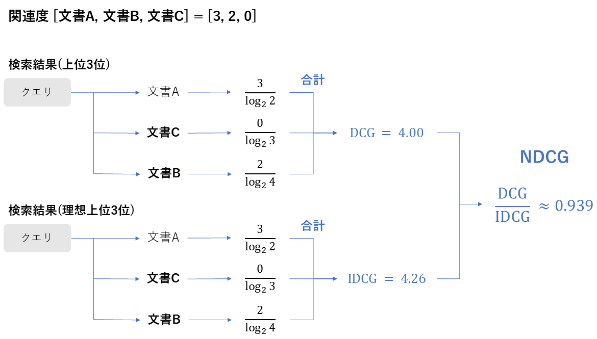 \mathrm{rel}_i: 順位 i における文書の関連度 \mathrm{DCG@k}: 実際の検索結果の割引累積利益 \mathrm{IDCG@k}: 理想的な検索結果の場合の割引累積利益