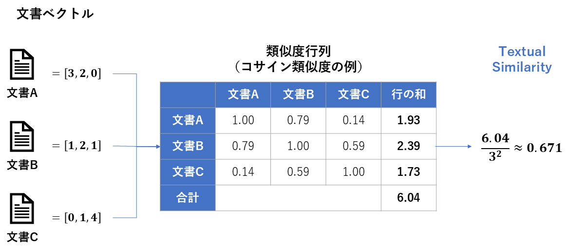 | 前提 | 類似度の計算方法には、Jaccard係数(単語の一致)やコサイン類似度(ベクトルの近さ)が使われる。 |