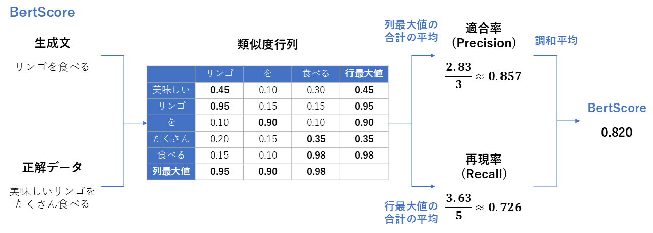$$ METEOR = (1-p) \frac{(\alpha^2+1)\mathrm{Precision} × \mathrm{Recall}}{\mathrm{Recall} + \alpha \mathrm{Precision}} $$ (BertScoreはコサイン類似度に基づく計算)