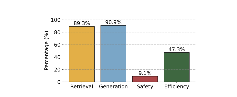 - 外部評価(安全性):一方で、安全性(Safety)に関する評価はわずか9.1%に留まっています。 実運用ではハルシネーションやポイズニング攻撃への対策が急務ですが、研究分野ではまだ「性能(精度)」の追求が優先されており、安全性の評価手法確立は発展途上であることがわかります。