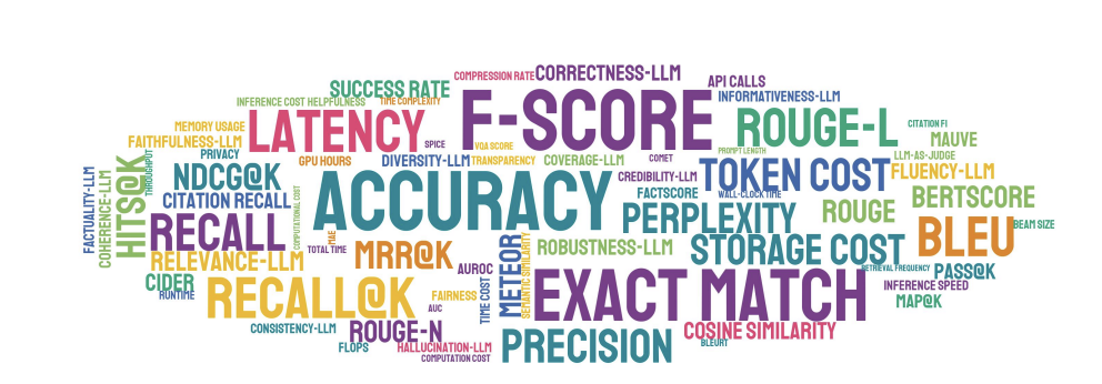 ワードクラウドを見ると、Accuracy, F1-Score, Exact Match, Recall といった「従来の評価指標」が圧倒的に大きく、支配的であることがわかります。