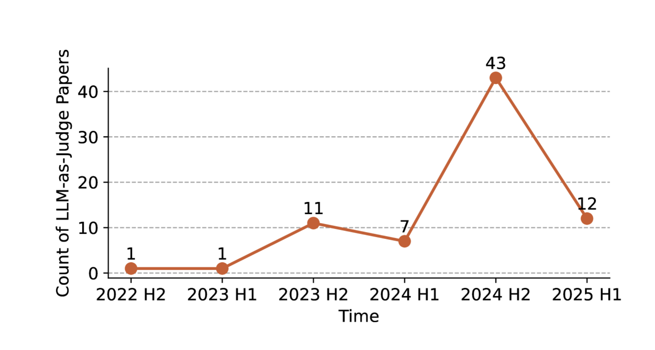 しかし時系列でのトレンドを見ると、課題がありつつもLLMベースの評価手法の採用数は増加しています。