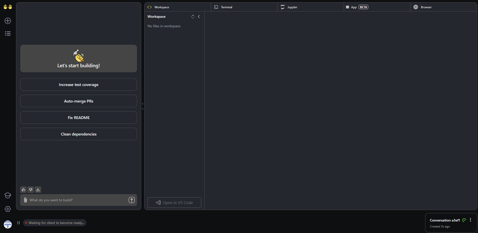 選択後には下記の画面に遷移します。 Workspaceにリポジトリの内容が反映されて、チャットが開始できるようになるまで1分程度かかりました。