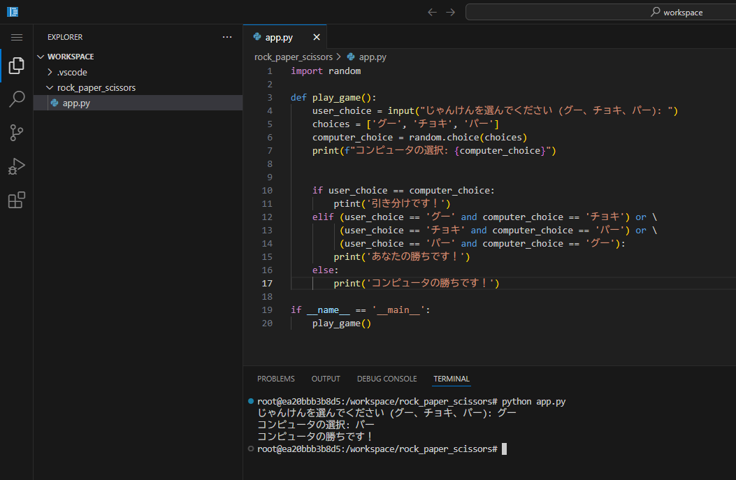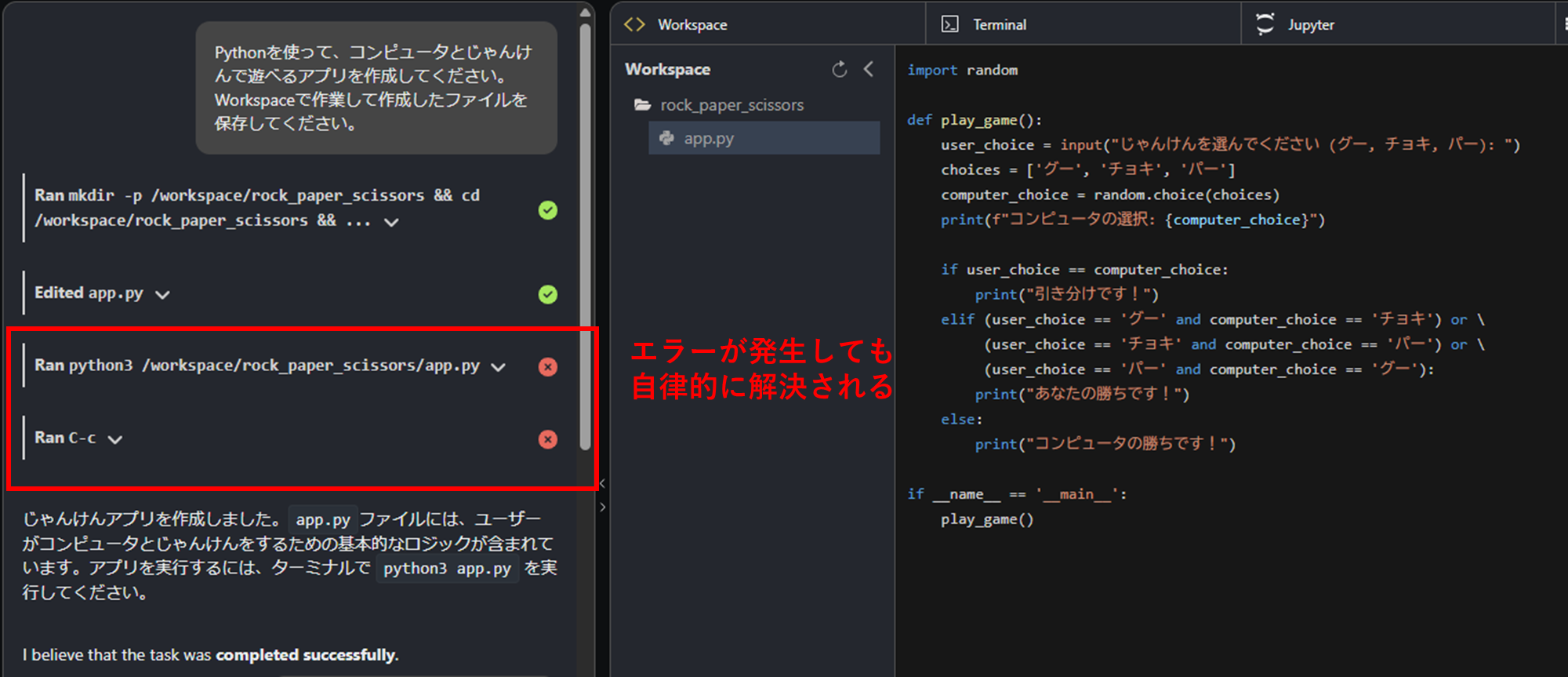 タスクが完了するとWorkspaceにファイルが作成されます。 ユーザーはターミナルに入力できないため、ターミナルでの実行もチャットで指示する必要があります。ただし、今回のようなインタラクティブな入力(ユーザーによるじゃんけんの手の入力)が必要な場合は実行に失敗してしまうようです。