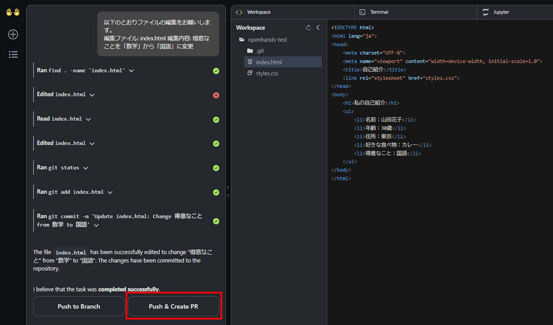 ファイルの編集が完了した後、「Push & Create PR」を選択します。 今回はCommitまでしていますが、OpenHandsがどこまで対応するかはばらつきがあります。ただし、勝手にPushまですることはないようです。
