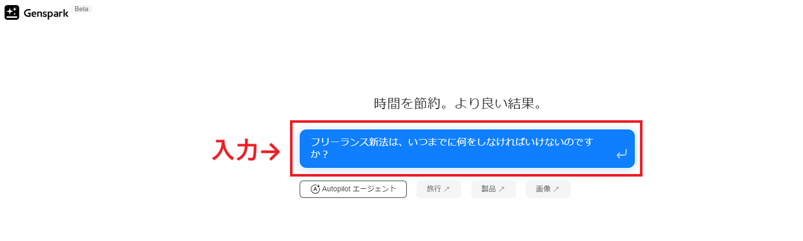- 使い方 Gensparkにアクセスして、知りたいことを入力するだけ! 疑問形でも、単語でも適切な回答をしてくれます。