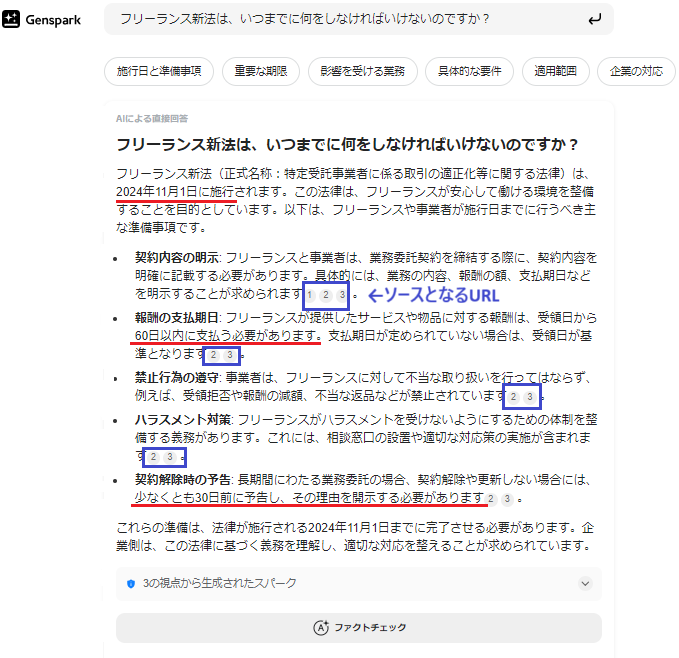 Gensparkの回答 様々な信頼できる情報源から**「正確な期限」と「重要なこと」を要約して具体的に回答してくれました。 「60日以内に支払う」や「30日前に予告」など、具体的に押さえておくべきポイントも明示してくれています。 ソースとなるURLも、「厚労省」や「公正取引委員会」などの公式HP**や、信頼できる企業の記事。