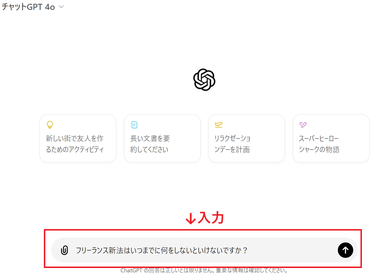 プロンプト入力 今回は、無料版で使用できる「ChatGPT-4o」を使用しました。 Gensparkと同じく、「いつまでに何をしないといけないですか?」と抽象的な質問してみます。