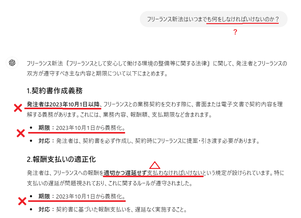 ChatGPTの回答 プロンプト(質問内容)がなぜか書き換わってしまいましたが、それは置いておいて回答を確認してみます。 まず気になったのが、「期限が正確でないこと」と「回答があいまいでわかりにくいこと」。 Gensparkでは「60日以内」や「30日前」など具体的な回答をしてくれましたが、ChatGPTでは「遅延せず」や「一定期間」などあいまいな回答のため、回答に対しての疑問が生まれます。 何回も質問して、文字数の上限に達してしまうのはこのためですね。