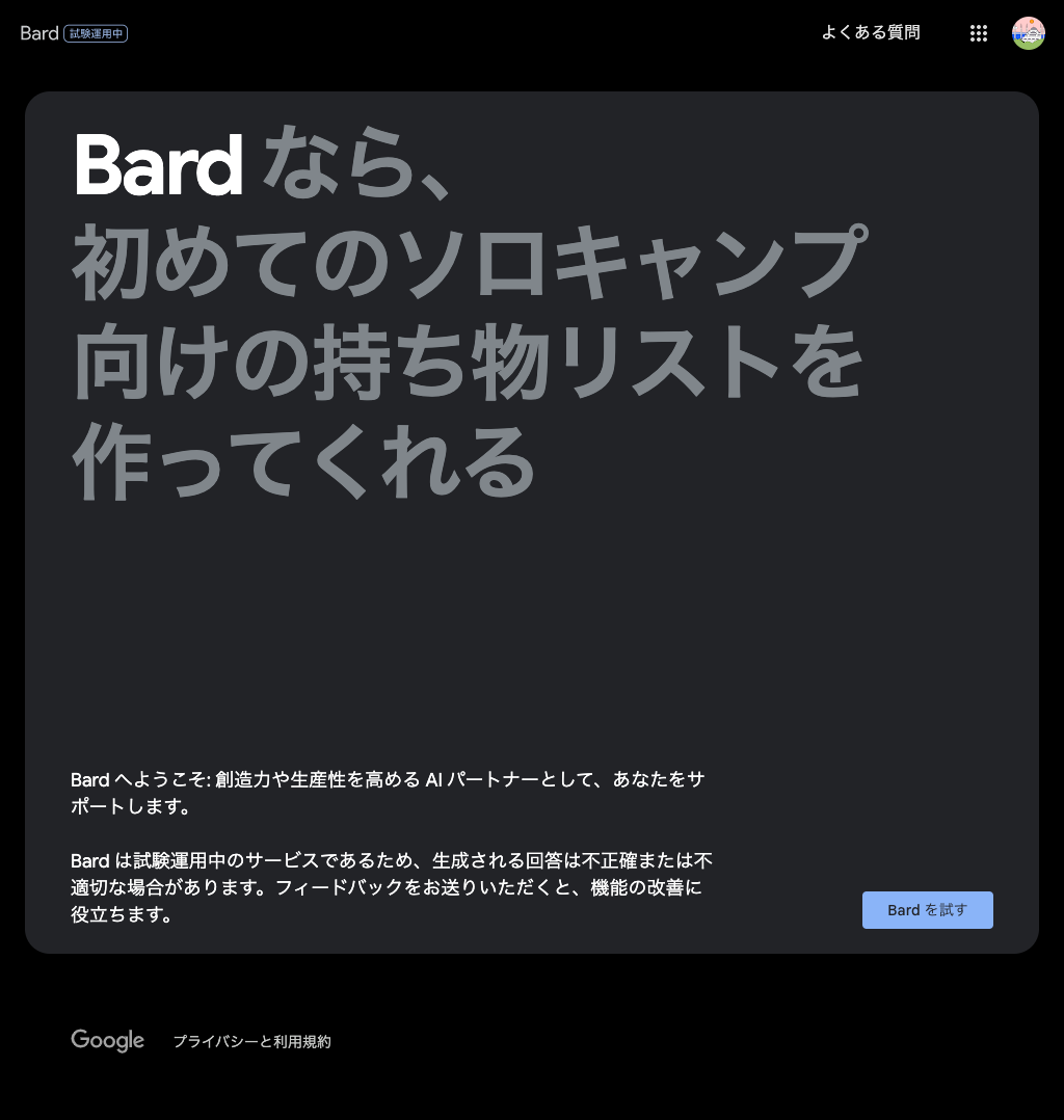 Bardを使うには、ここからアクセスしてください。 Bardを試すをクリック。