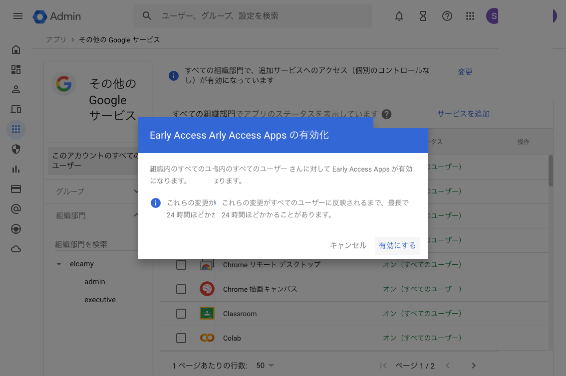 アプリ > その他の Google サービス > Early Access Arly Access Apps の有効化