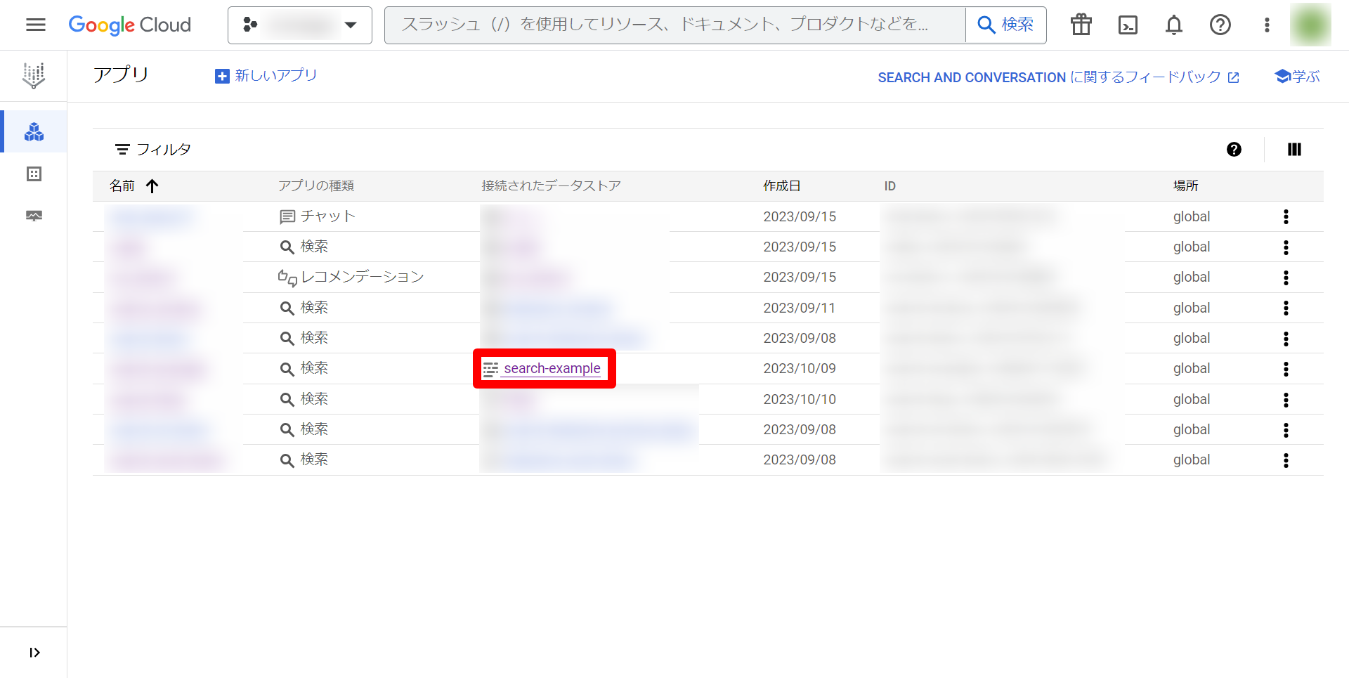 まず、Vertex AI Searchのアプリの一覧ページに移動し、上記で作成したアプリの接続されたデータストアを選択します。今回は「search-example」というデータストアを作成しました。