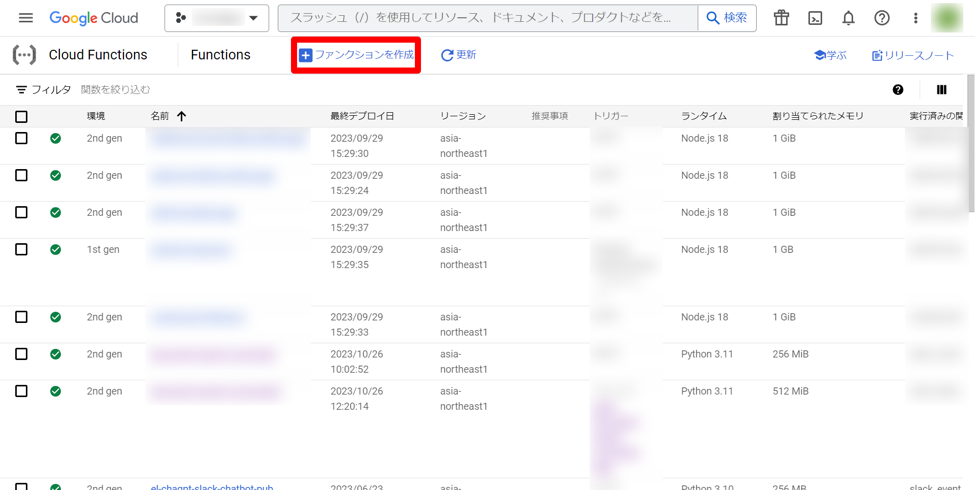 まず、Cloud Functionsのページに移動し、ファンクションを作成を選択します。