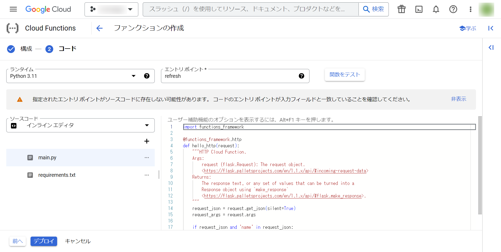最後に、ファンクションのコードの入力項目を埋めて、デプロイします。